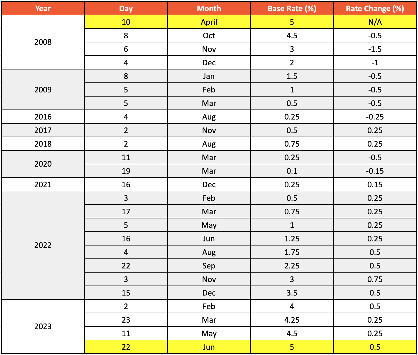 | The Bank of England has just made the decision to increase interest rates from 4.5% to 5%. This marks a 13th consecutive hike since rates were first increased in December 2021 from a low of 0.1% to 0.25%.